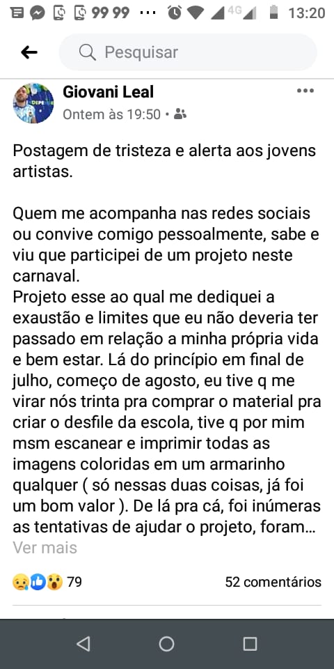 Depois da conversa com o Carnaval N1, Giovani preferiu colocar a postagem como privada e nos bloqueou o meio de comunicação conosco.