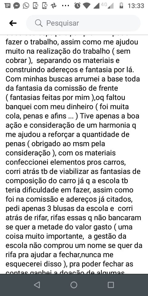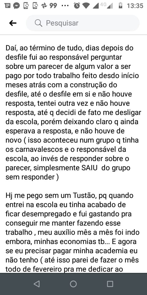 Daí, ao término de tudo, dias depois do desfile fui ao responsável perguntar sobre um parecer de algum valor a ser pago por todo trabalho feito desdo início meses atrás com a construção do desfile, até o desfile em si e não houve resposta, tentei outra vez e não houve resposta, até q decidi de fato me desligar da escola, porém deixando claro q ainda esperava a resposta, e não houve de novo ( isso aconteceu num grupo q tinha os carnavalescos e o responsável da escola, ao invés de responder sobre o parecer, simplesmente SAIU do grupo sem responder )