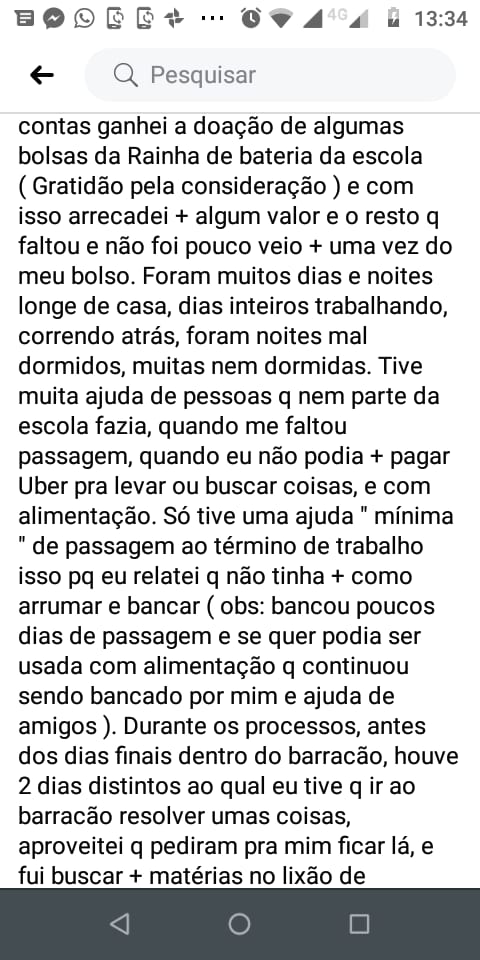 Projeto esse ao qual me dediquei a exaustão e limites que eu não deveria ter passado em relação a minha própria vida e bem estar. Lá do princípio em final de julho, começo de agosto, eu tive q me virar nós trinta pra comprar o material pra criar o desfile da escola, tive q por mim msm escanear e imprimir todas as imagens coloridas em um armarinho qualquer ( só nessas duas coisas, já foi um bom valor ). De lá pra cá, foi inúmeras as tentativas de ajudar o projeto, foram buscas incessantes por material em todo cando dessa cidade e fora dela tb ( custeado por mim msm ), foi muita passagem de ônibus, vários Uber, até Combi eu paguei pra buscar material, revirei muito lixo com resto de materiais descartados, materiais esse q eu levava pra casa de um amigo q gentilmente me doou seu espaço e paz pra mim poder fazer o trabalho, assim como me ajudou muito na realização do trabalho ( sem cobrar ), separando os materiais e construindo adereços e fantasia por lá. Com minhas buscas arrumei a base toda da fantasia da comissão de frente ( fantasias feitas por mim ),oq faltou banquei com meu dinheiro ( foi muita cola, penas e afins … ) Tive apenas a boa ação e consideração de um harmonia q me ajudou a reforçar a quantidade de penas ( obrigado ao msm pela consideração ), com os materiais confeccionei elementos pros carros, corri atrás tb de viabilizar as fantasias de composição do carro já q a escola tb teria dificuldade em fazer, assim como foi na comissão e adereços já citados, pedi apenas 3 blusas da escola e corri atrás de rifar, rifas essas q não bancaram se quer a metade do valor gasto ( uma coisa muito importante, a gestão da escola não comprou um nome se quer da rifa pra ajudar a fechar,nunca me esquecerei disso ), pra poder fechar as contas ganhei a doação de algumas bolsas da Rainha de bateria da escola ( Gratidão pela consideração ) e com isso arrecadei + algum valor e o resto q faltou e não foi pouco veio + uma vez do meu bolso. Foram muitos dias e noites longe de casa, dias inteiros trabalhando, correndo atrás, foram noites mal dormidos, muitas nem dormidas. Tive muita ajuda de pessoas q nem parte da escola fazia, quando me faltou passagem, quando eu não podia + pagar Uber pra levar ou buscar coisas, e com alimentação. Só tive uma ajuda ” mínima ” de passagem ao término de trabalho isso pq eu relatei q não tinha + como arrumar e bancar ( obs: bancou poucos dias de passagem e se quer podia ser usada com alimentação q continuou sendo bancado por mim e ajuda de amigos ). Durante os processos, antes dos dias finais dentro do barracão, houve 2 dias distintos ao qual eu tive q ir ao barracão resolver umas coisas, aproveitei q pediram pra mim ficar lá, e fui buscar + matérias no lixão de matérias q existe lá dentro msm do galpão das escolas ( esses 2 dias q me pediram pra ir lá, se quer perguntaram se eu precisava de algo, assim como em todo processo nunca perguntavam, passei esse 2 dias distintos lá com fome, com cede ( água não estava potável ), só me alimentei em casa a noite quando cheguei. Enfim chegou os últimos dias de real trabalho no barracão, dias esses q fiquei no barracão direto, trabalhando dia, noite, madrugada, dias esses q tive q comprar TB material ( cola ) pq oq davam era pouco e o trabalho não ia, não só comprei como ganhei de amigos q lá fiz ( nunca vou esquecer um companheiro de outra escola me falando q me daria cola e ajudaria no q podesse pq via meu sofrimento e meu esforço ), companheiro de equipe tendo q trazer material de pintura de outra escola pra podermos terminar o básico de algumas pinturas. Com sobra de matérias oriundas das composições do carro viraram foro pra traseira do carro, os vários sacos de flores artificiais comprados por mim e amigo tb pra adereçar a alegoria, assim como os búzios usados na alegoria oriundos da busca q fiz por material, as bonequinhas das orixás usadas q eu mandei fazer pra enfeitar a alegoria, e afins… Enfim chega o dia de saída do carro pro desfile, além do dia inteiro e noite trabalhado no barracão , passo a noite sem dormir no meio da rua, tomando conta do carro , aproveitando pra adereçar e ajudar no q podia ( obs: as escolas pagam alguém pra olhar os carros, ou tem alguém responsável da escola lá pra isso, e até isso eu fui e fiz, outra obs: era uma noite fria de garoa/chuvisco ). Chegou o dia de fato do desfile, estava eu sem dormir e trabalhando, até meia hora antes do desfile estava eu arrumando as coisas do carro pra escola passar dignamente ( e assim foi ), tive q usar uma calça, um tênis apertado emprestados pq não tive como ir em casa me arrumar. Então dedicação, exaustão, consideração e ajuda da minha parte não faltou. Não venho relatar essas coisas afim de jogar na cara não, faço isso pra mostrar a imensa falta de respeito e gratidão.