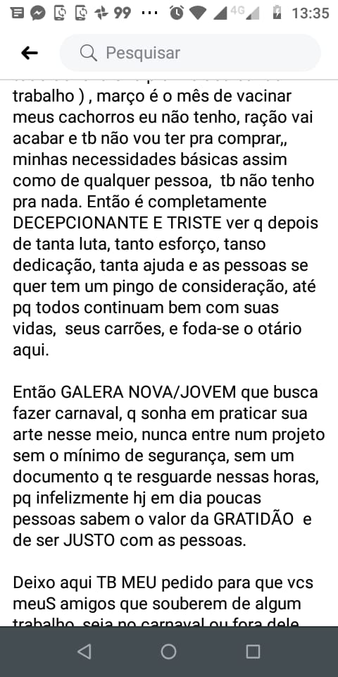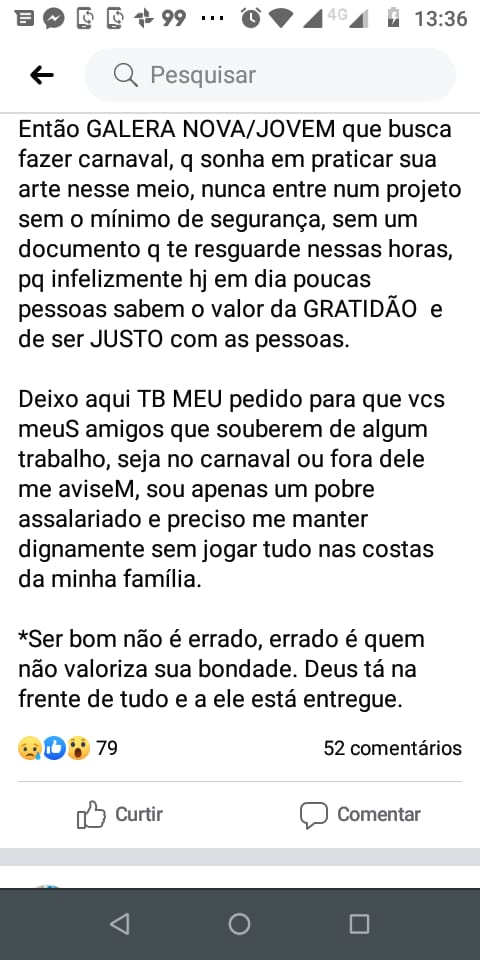 Deixo aqui TB MEU pedido para que vcs meuS amigos que souberem de algum trabalho, seja no carnaval ou fora dele me aviseM, sou apenas um pobre assalariado e preciso me manter dignamente sem jogar tudo nas costas da minha família.